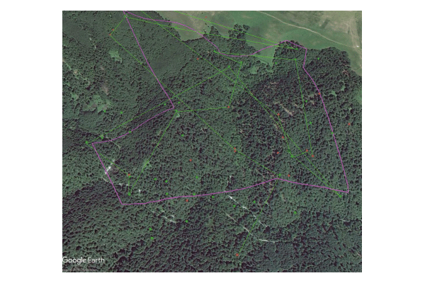 Los pollos nacidos este año aún se mueven por el bosque con los adultos, constituyendo grupos familiares a menudo ruidosos. En la imagen pueden apreciarse los movimientos efectuados por un adulto reproductor de pico dorsiblanco en el mes de julio.